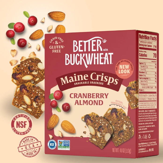 These crisps combine tart cranberries, wildflower honey, and organic seeds with savory Herbes de Provence for a unique flavor. Perfectly crispy, these crackers pair excellently with soft, oozy cheeses, making them a gourmet addition to any snack platter. Everyone Loves Our GF Crisps: ✨Made in the USA; proudly supporting the Maine community 👩Woman-founded 🌿Health-Conscious: Our crackers are certified gluten-free and made with nutrient-dense buckwheat and organic seeds 🍯 Sweet and sour: Tart cranberries and wildflower honey balanced with Herbes de Provence 🧀 Perfect Pairing Cracker: Ideal with triple-crème cheeses like Saint André or clothbound cheddars. Crafted in a certified gluten-free facility.